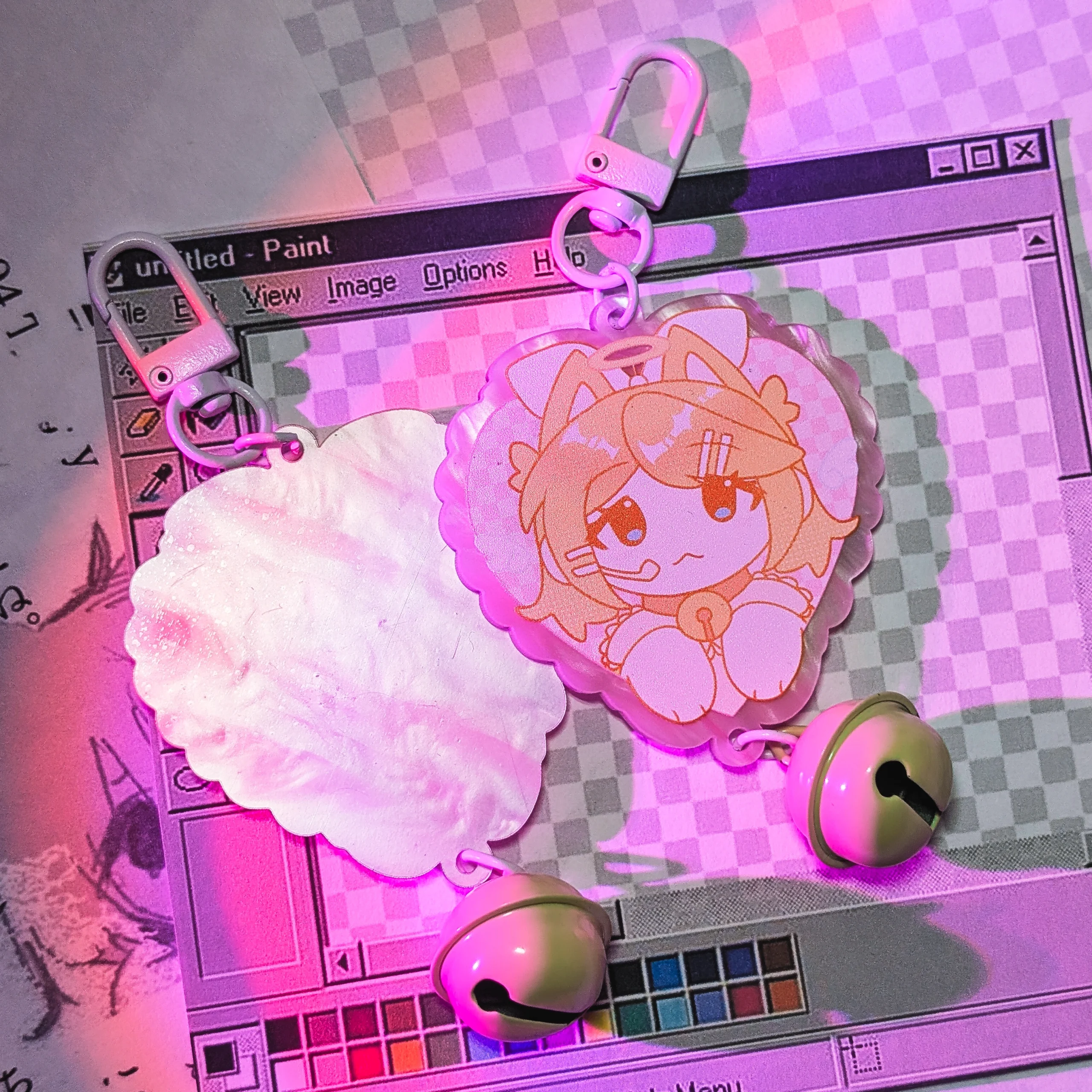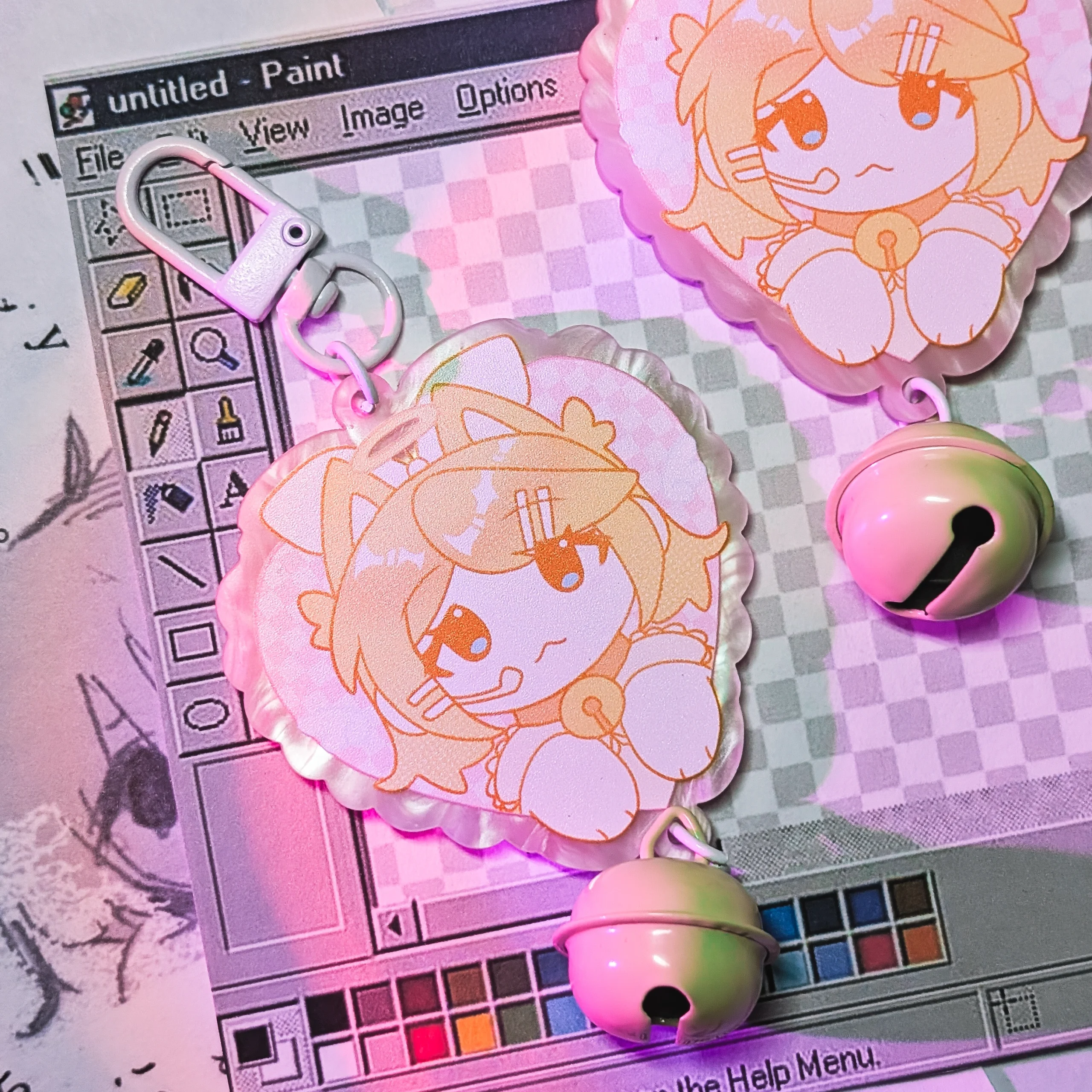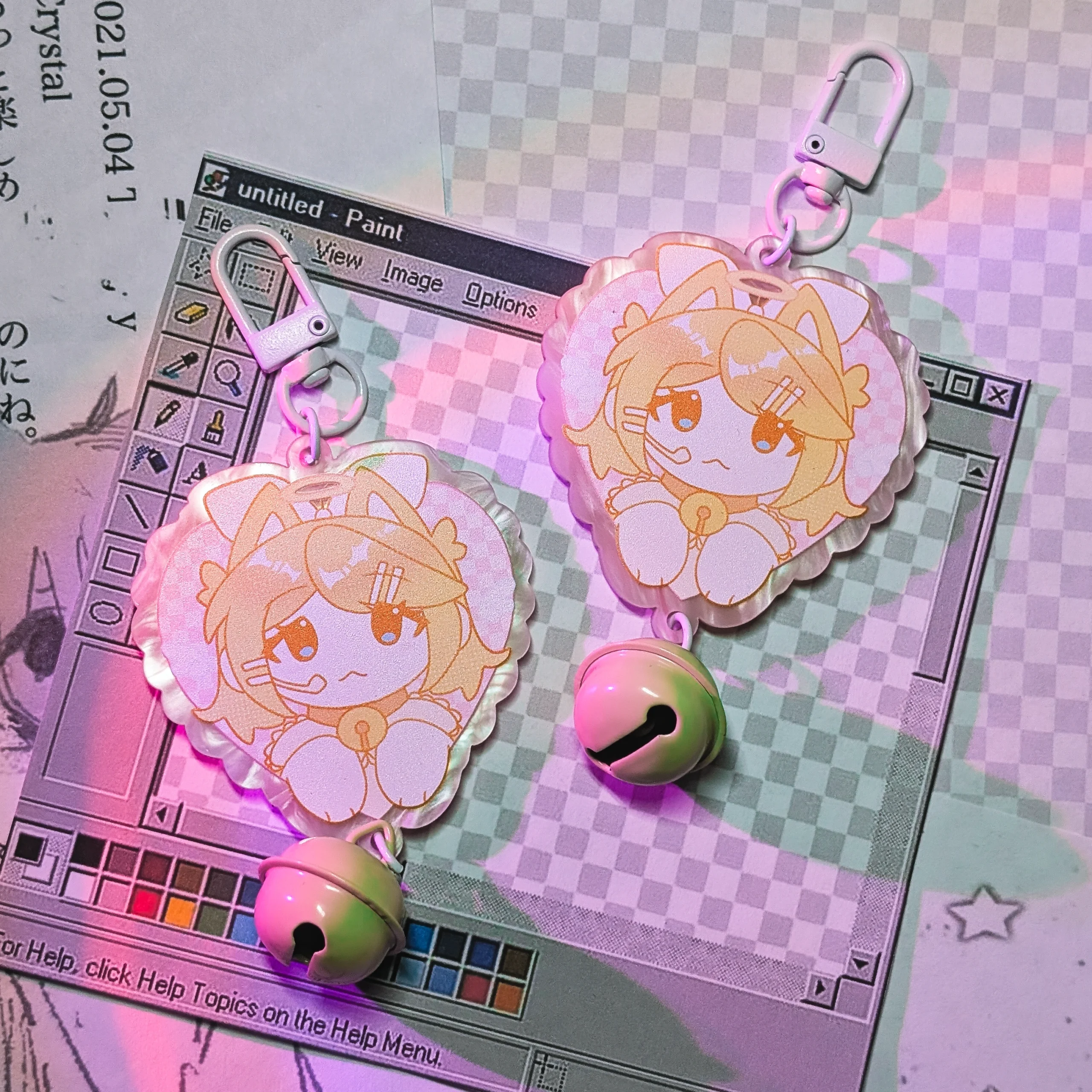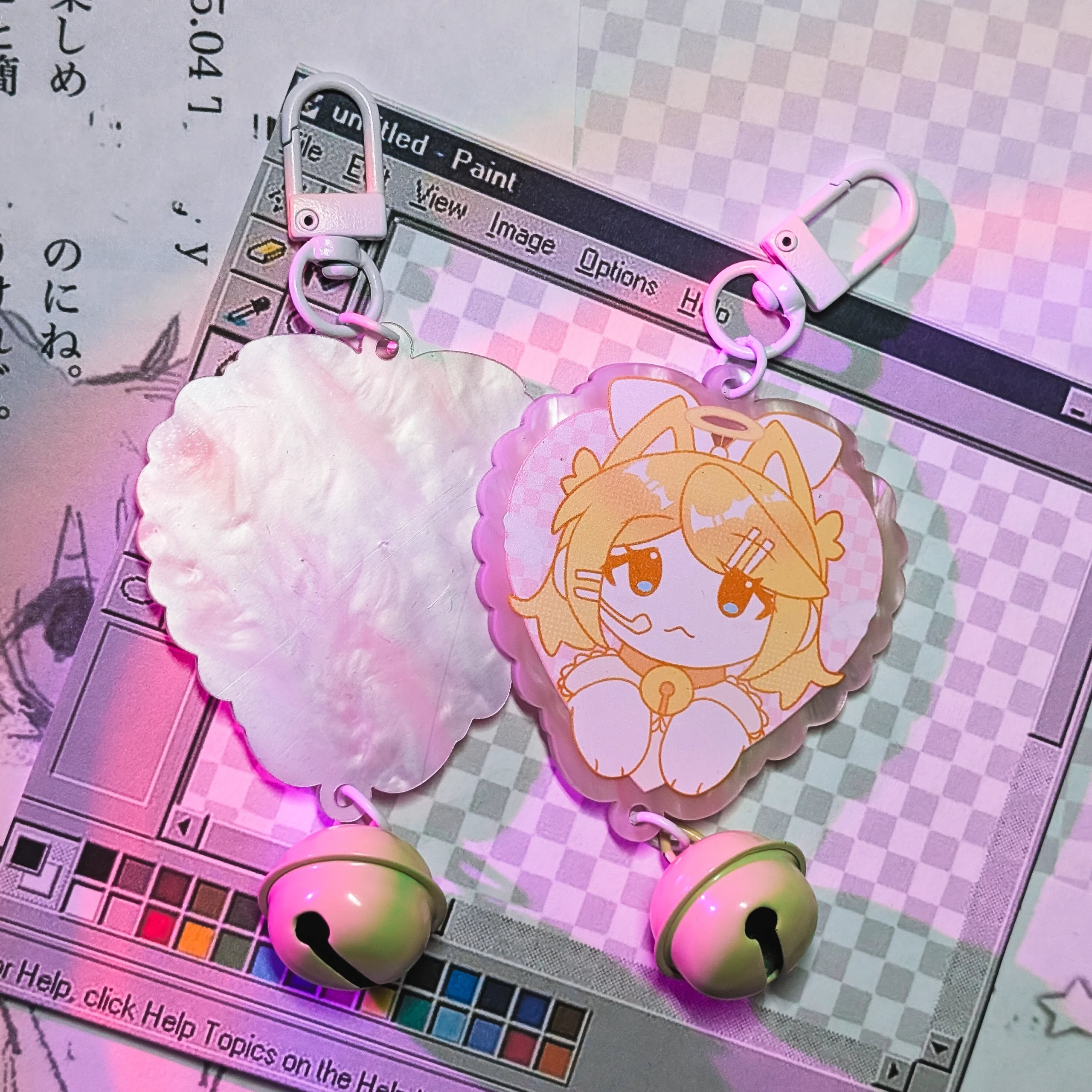 Брелок на жемчужном акриле с бубенчиком и вокалоидом Рин размер 6 см