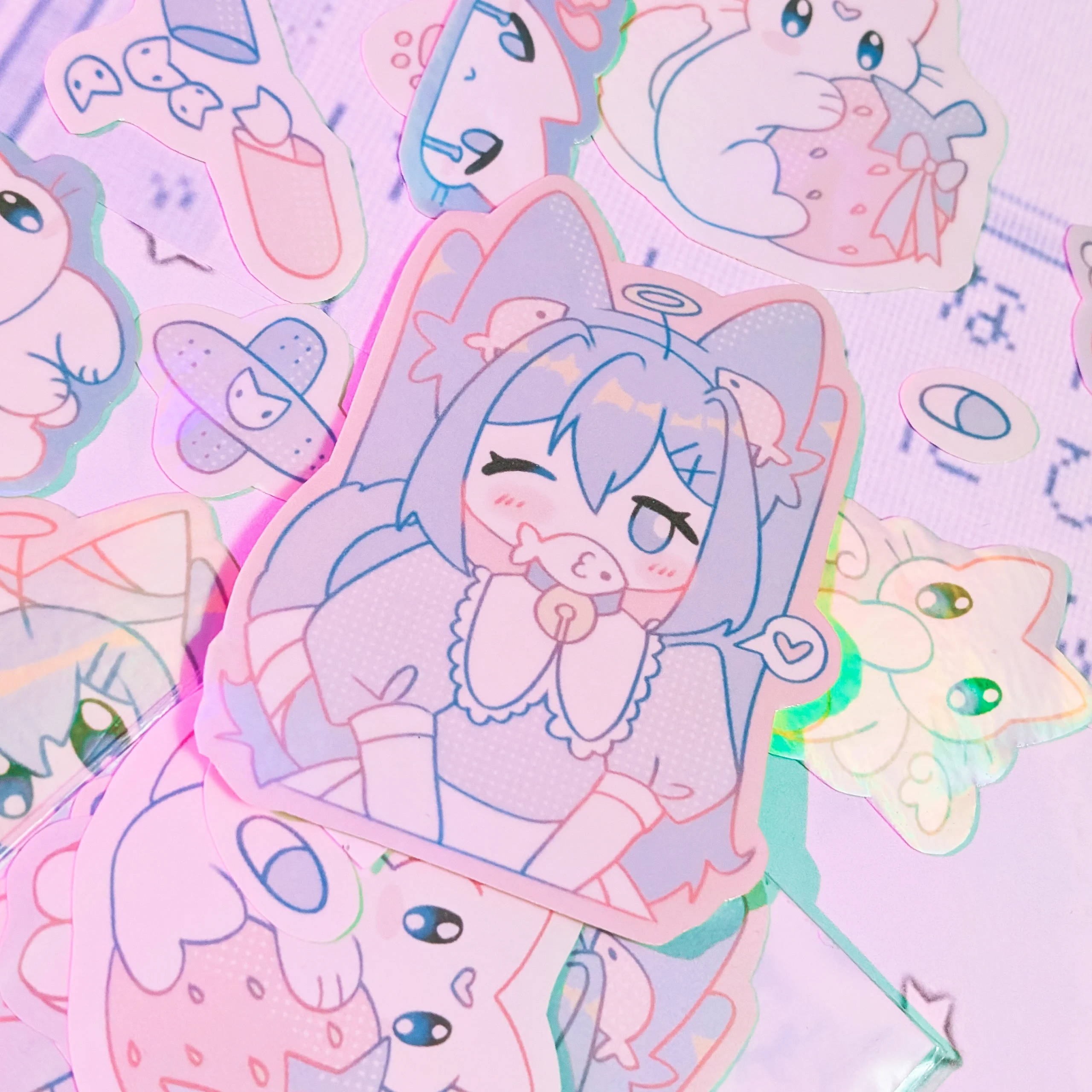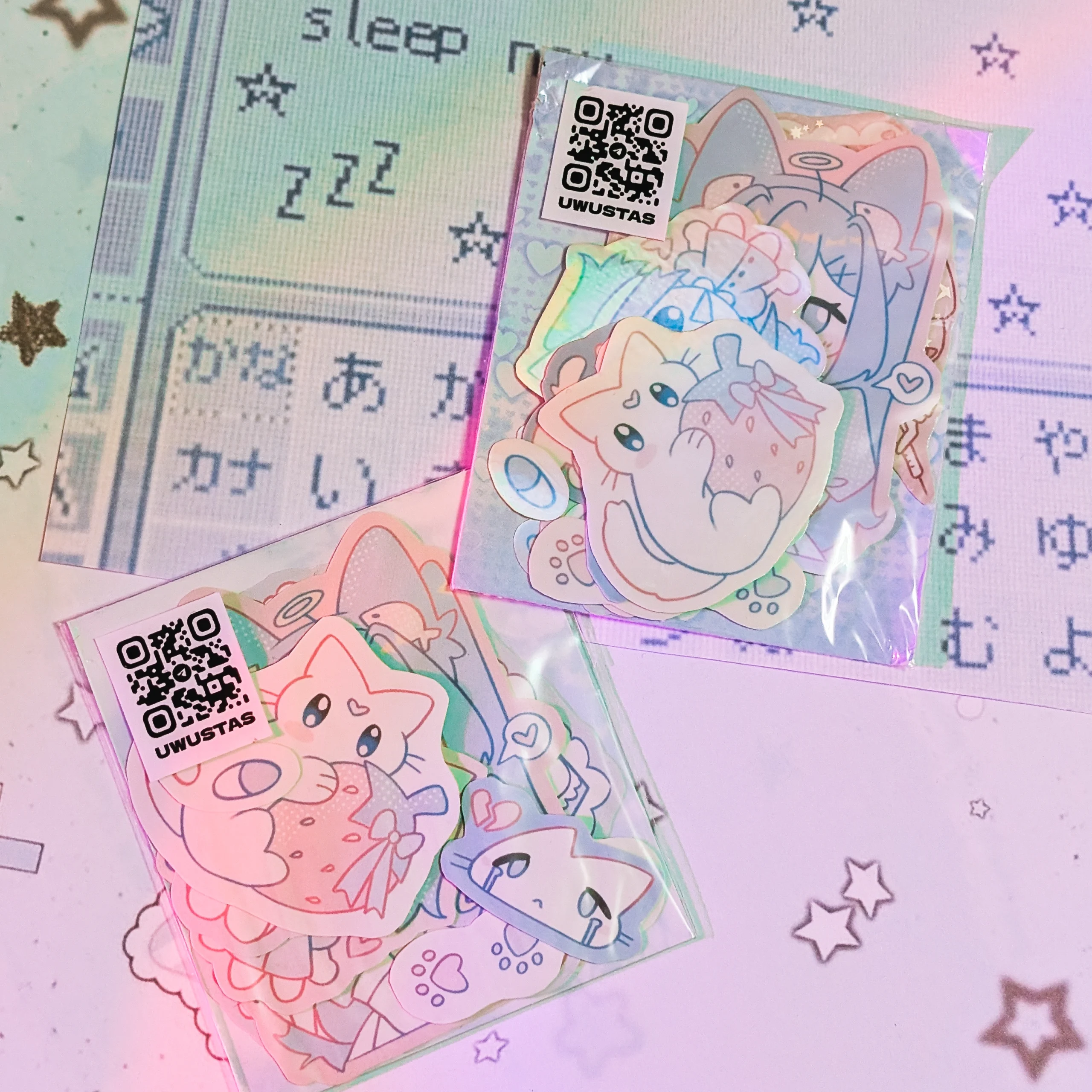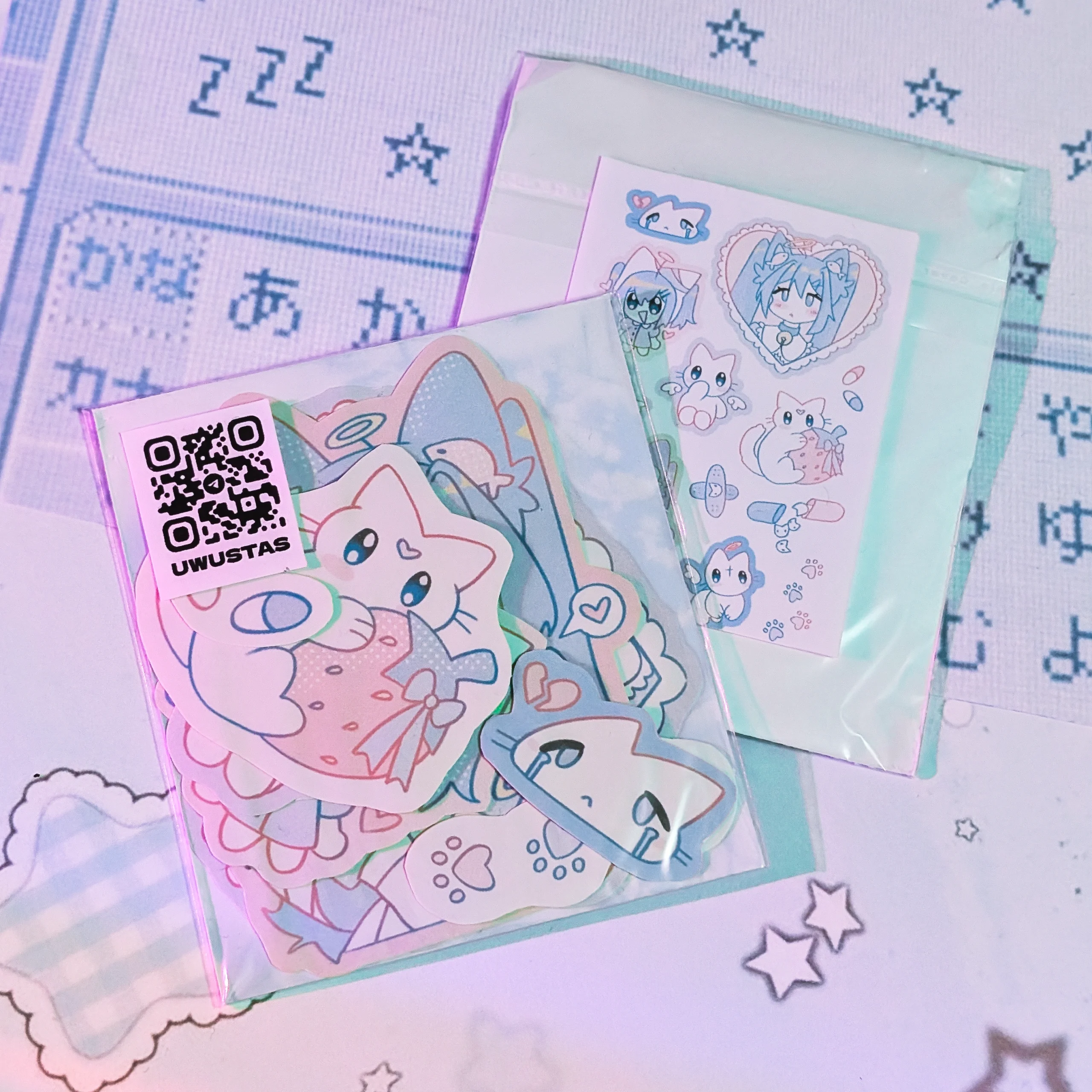 Набор бумажных стикеров в голубой гамме с тематикой котят и Хатсуне Мику